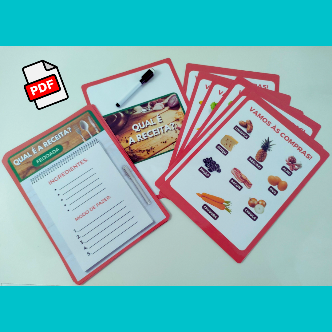 O arquivo “Qual é a Receita?” contém 12 cartelas (28,5cm x 20cm) com o objetivo de estimular principalmente habilidades relacionadas a linguagem e memória semântica, além de estimular funções executivas de planejamento e metacognição.